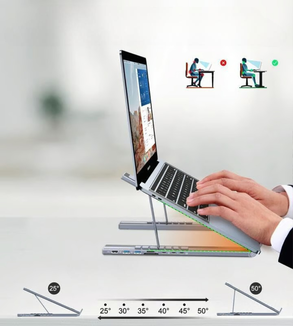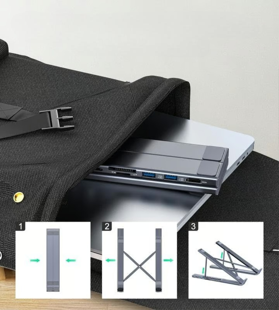 👩💻Dette 8-i-1 USB-C laptopstativ kombinerer et robust justerbart laptopstativ med en komplet dockingstation.