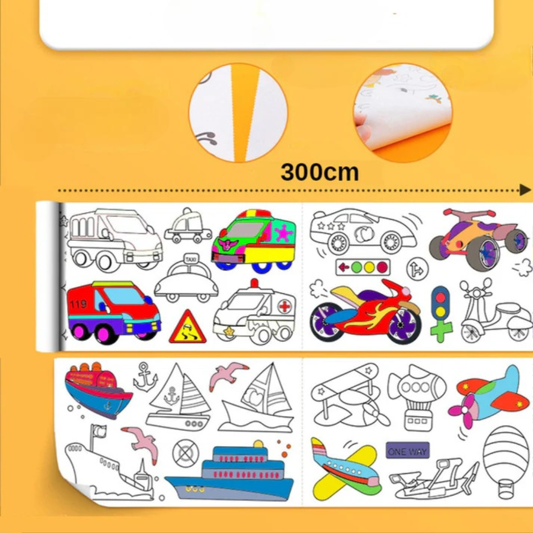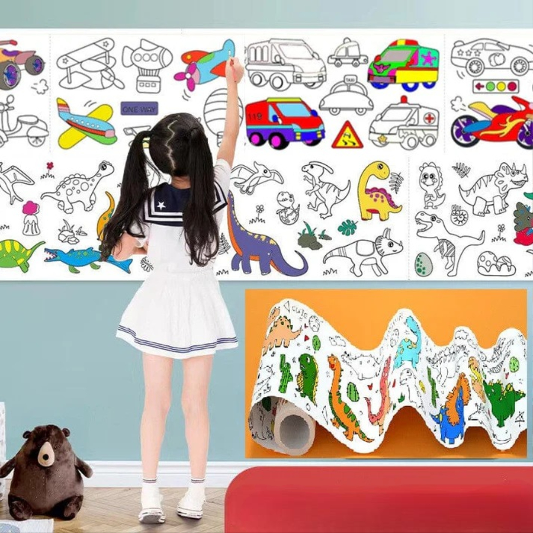 Denne farverulle forvandler vægge, gulve eller borde til kreative legeområder for børn. Bare sæt den fast, farvelæg, og lad fantasien få frit løb! Med sjove temaer som dinosaurer, dyr, transport eller prinsesser holder den de små beskæftiget i timevis – ingen gentagelser, ingen kedsomhed.