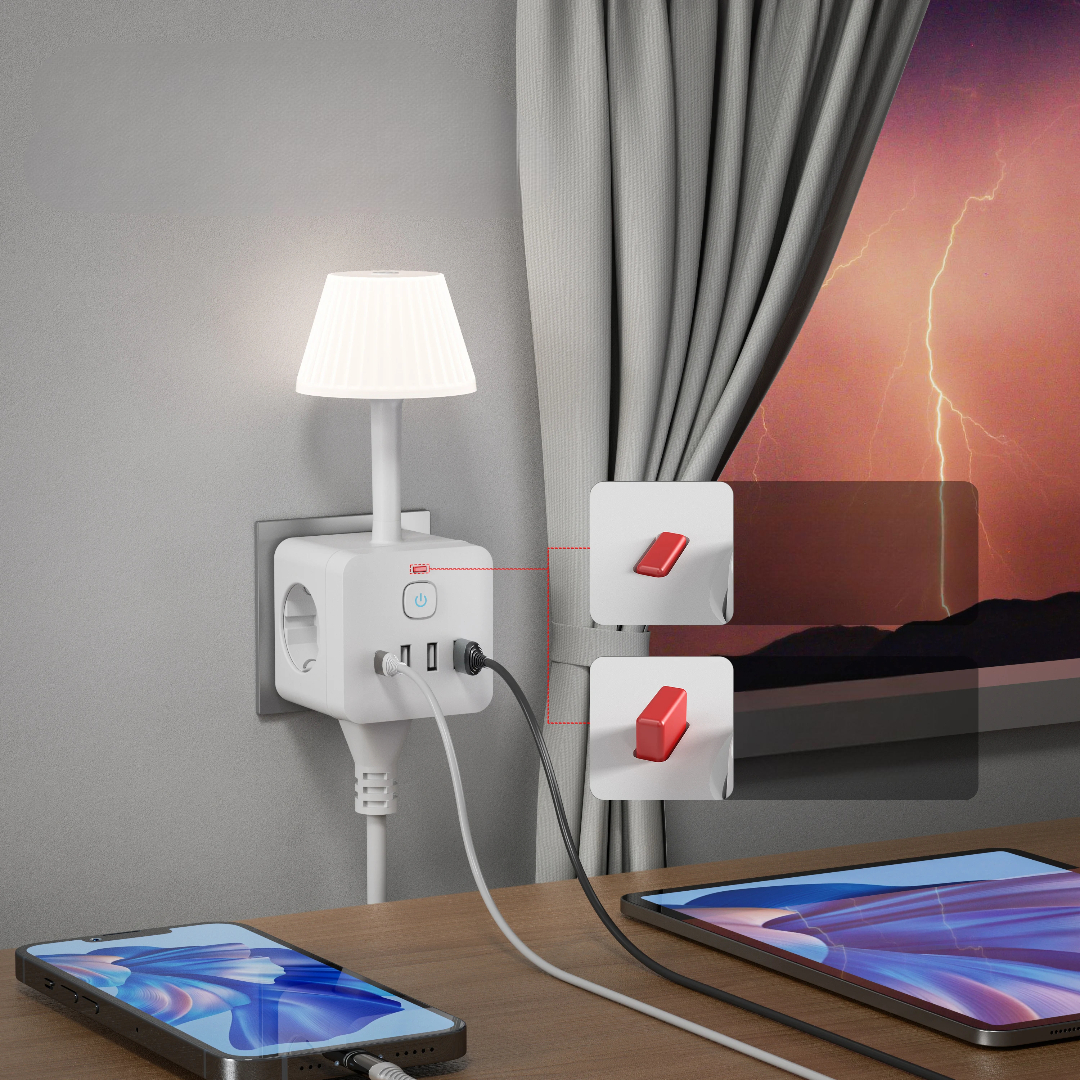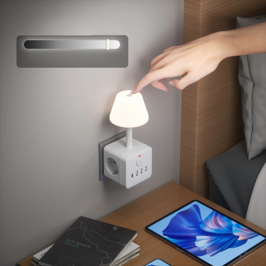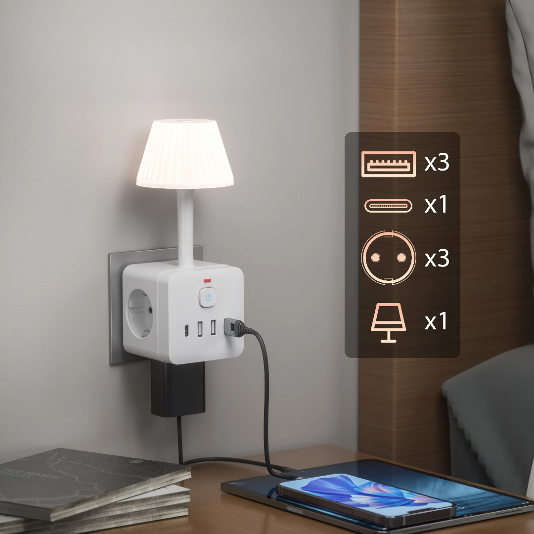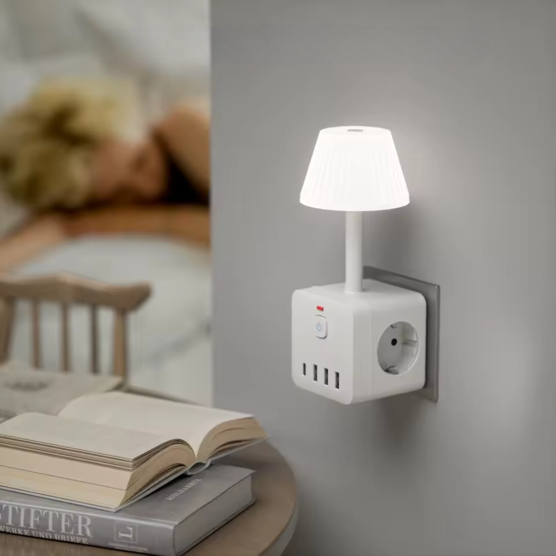 🔌 Alt-i-et-design – Lampe, stikkontakt og oplader i én enhed.