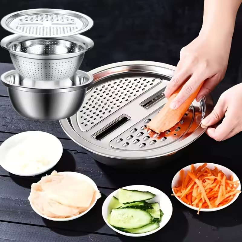 🍽️Made af holdbart rustfrit stål hjælper det dig med at tilberede grøntsager og frugt hurtigt, samtidig med at dit køkken holdes rent og organiseret.