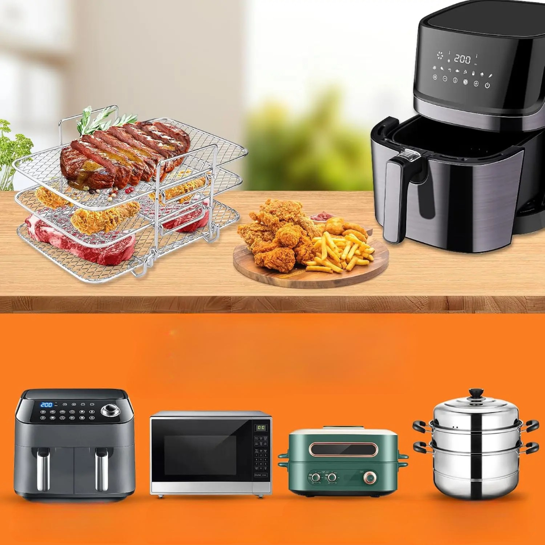 🔥Dette frituregryde-stativ tilføjer tre stabelbare lag til din frituregryde, så den varme luft kan cirkulere jævnt omkring din mad.