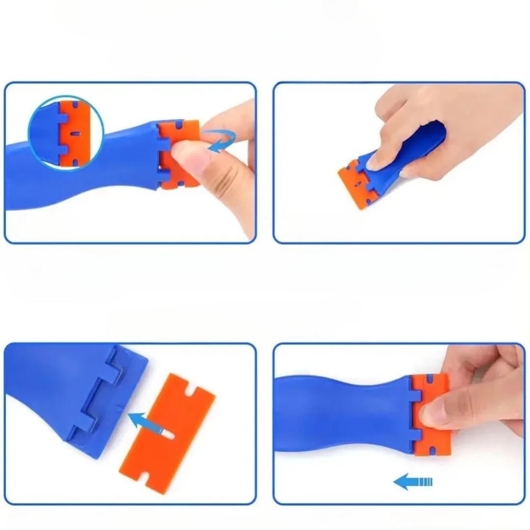 This multifunctional razor blade scraper is designed to safely remove adhesive, labels, residue, and dirt from many surfaces. It uses durable plastic blades instead of metal, so you get strong cleaning power without damage. Compact, easy to hold, and simple to maintain, it is perfect for home, car, kitchen, and bathroom cleaning.