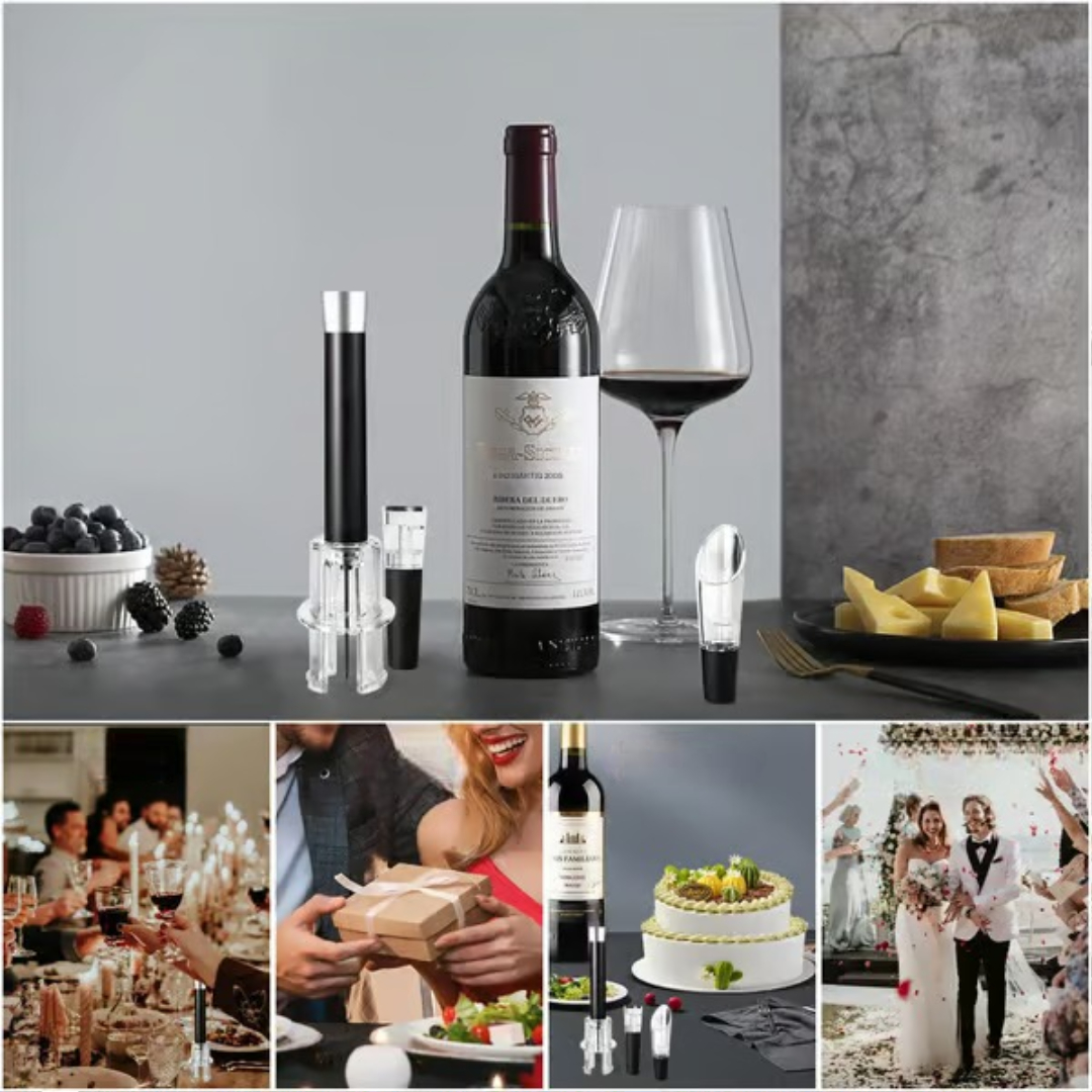 A wine opener set that removes corks quickly using air pressure for smooth, effortless opening. It prevents broken corks and includes essential tools for serving and preserving wine. Stylish and easy to use, it’s perfect for home use, entertaining, or gifting.