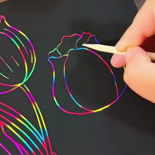 This creative rainbow scratch art notebook lets kids and adults create colorful drawings by scratching the black surface. It is safe, easy to use, and perfect for fun, creativity, and early learning. Made from thick, non-toxic paper, this scratch art notebook allows children to draw freely without mess or harmful materials. Just scratch with the wooden pen to reveal vibrant colors and create drawings, notes, or patterns you can proudly share.