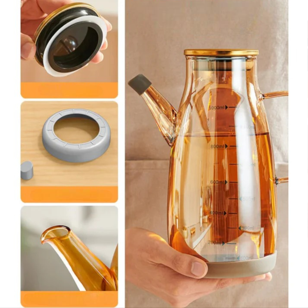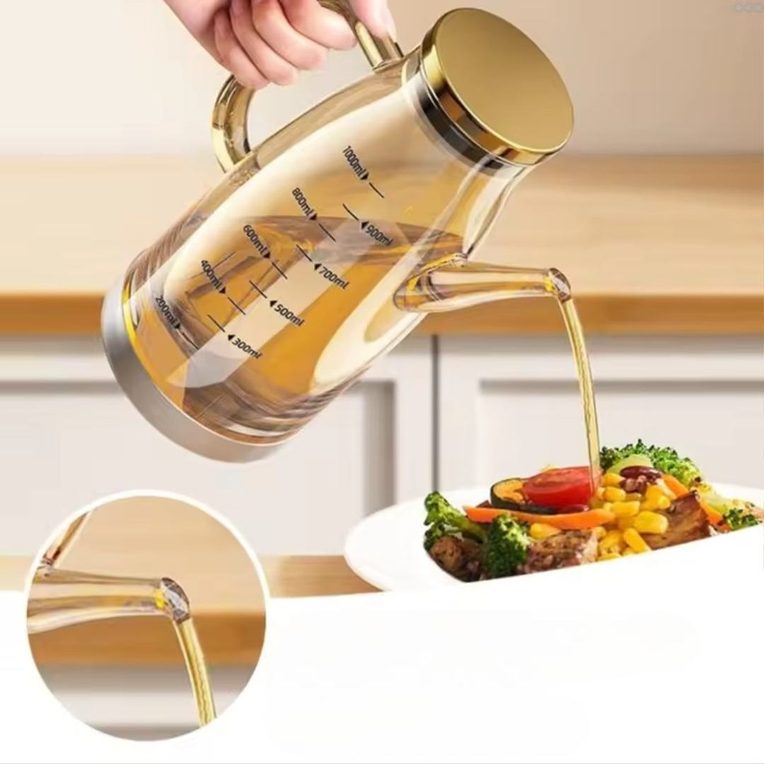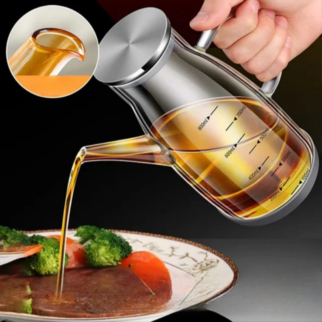 Med denne oljedispenserflasken kan du enkelt kontrollere mengden olje, eddik eller saus. Den dryppfrie tuten holder benkeplaten ren, mens den brede åpningen gjør påfylling og rengjøring raskt og enkelt. Perfekt til daglig matlaging, tilberedning av måltider og bordservering. En ren, stilig og praktisk flaske til ethvert kjøkken og spisebord.