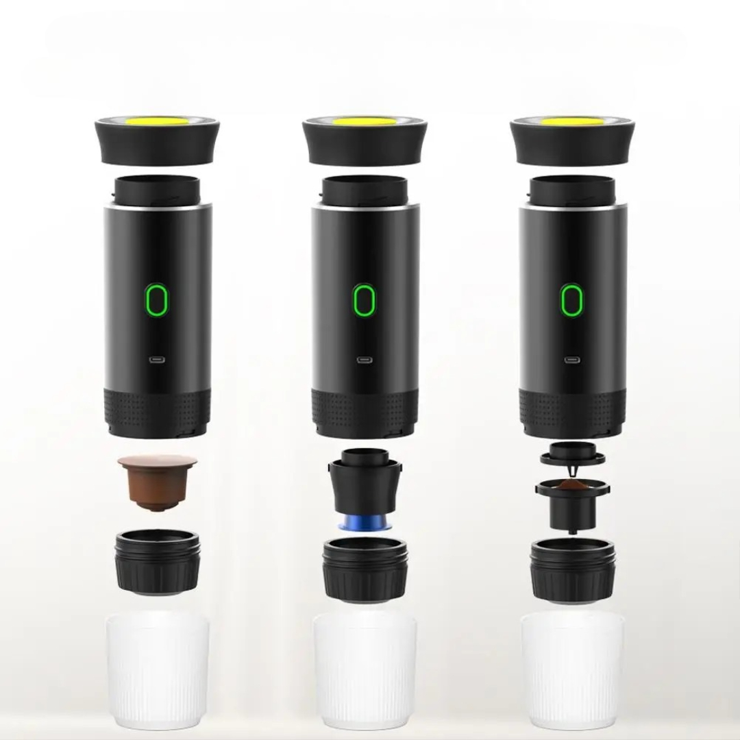 💧Den fungerar med kaffekapslar eller malet kaffe och värmer vatten trådlöst med hjälp av det inbyggda batteriet.