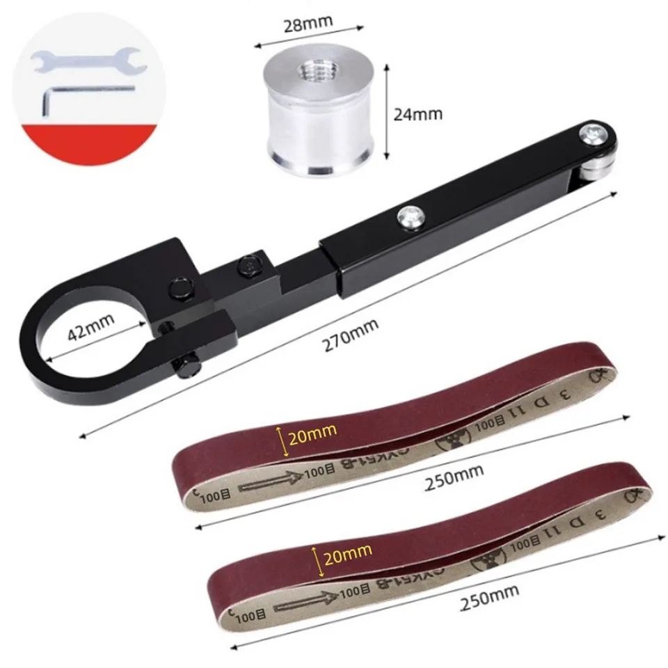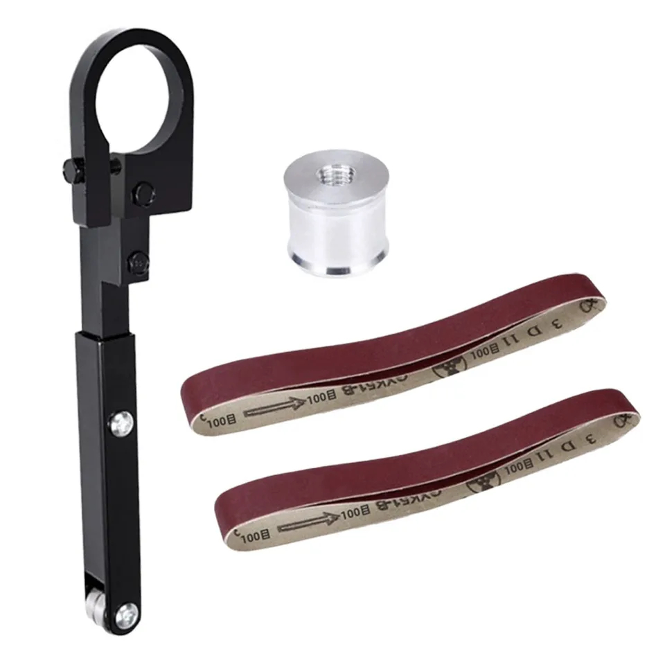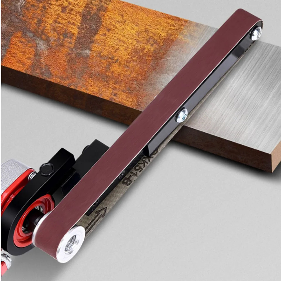 This angle grinding sand belt machine easily converts your standard angle grinder into a stable and efficient belt sanding tool. It delivers smooth grinding, polishing, and shaping for metal, wood, and other materials with better control and speed. This attachment uses an automatic belt tension system and a grooved drive wheel to keep the sanding belt steady and aligned. The solid aluminum build and double bearing design provide stable, fast, and precise sanding for daily workshop use.