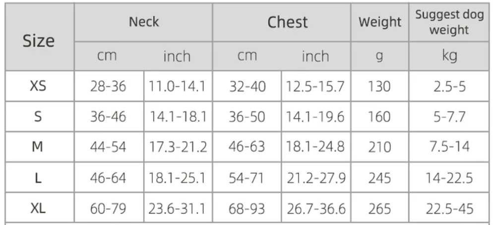 - Sizes: XS, S, M, L, XL (for small to large dogs)
