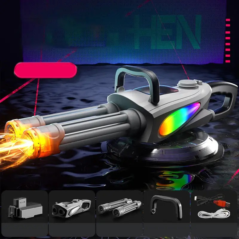 This double barrel gatling electric water gun delivers automatic, high-powered water blasts with long range and continuous fire—so you stay in control of every battle. No effort. Just action.