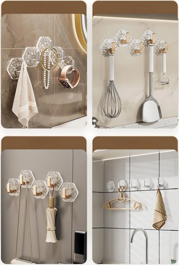 These hexagonal no-drill hooks use a strong self-adhesive system to hold everyday items safely. They install in seconds, look stylish, and work perfectly even in humid areas like bathrooms and kitchens.