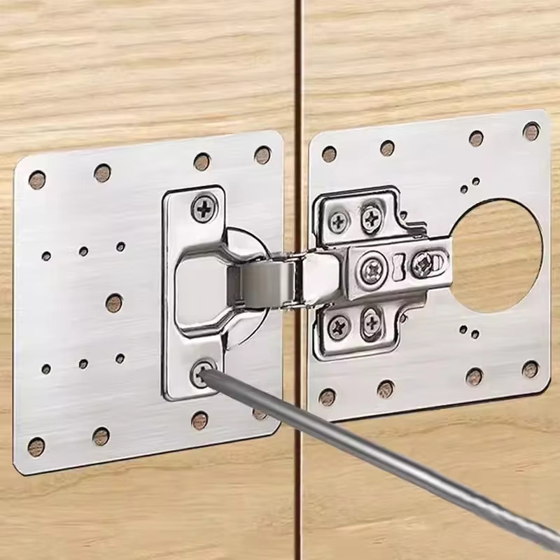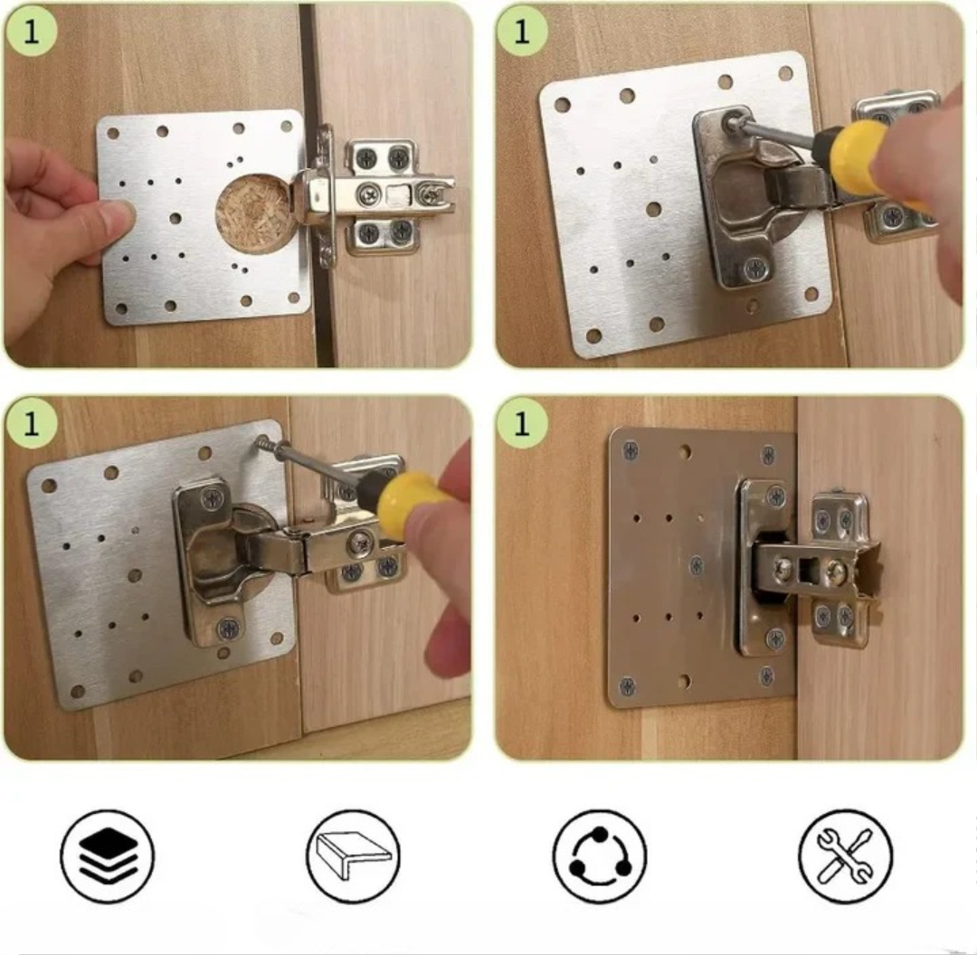 This hinge reinforcement plate strengthens loose hinges and covers damaged wood areas around screw holes, keeping your cabinet doors stable and secure. It restores support in minutes and gives your furniture a clean, finished look.