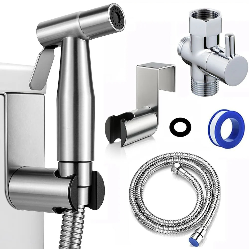 - Sizes: Handheld bidet sprayer (11 x 5.3 cm), T-valve adapter (1.27 cm), Stainless steel hose (148 cm)